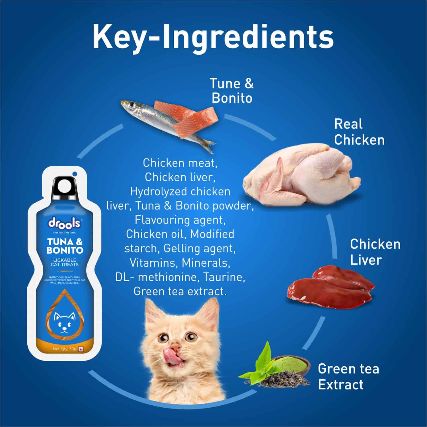 Chicken meat, Chicken liver, Hydrolyzed chicken liver, Salmon & skipjack powder, Flavouring agent, Chicken oil, Modified starch, Gelling agent, Vitamins, Minerals, DL-methionine, Taurine, Green tea extract.